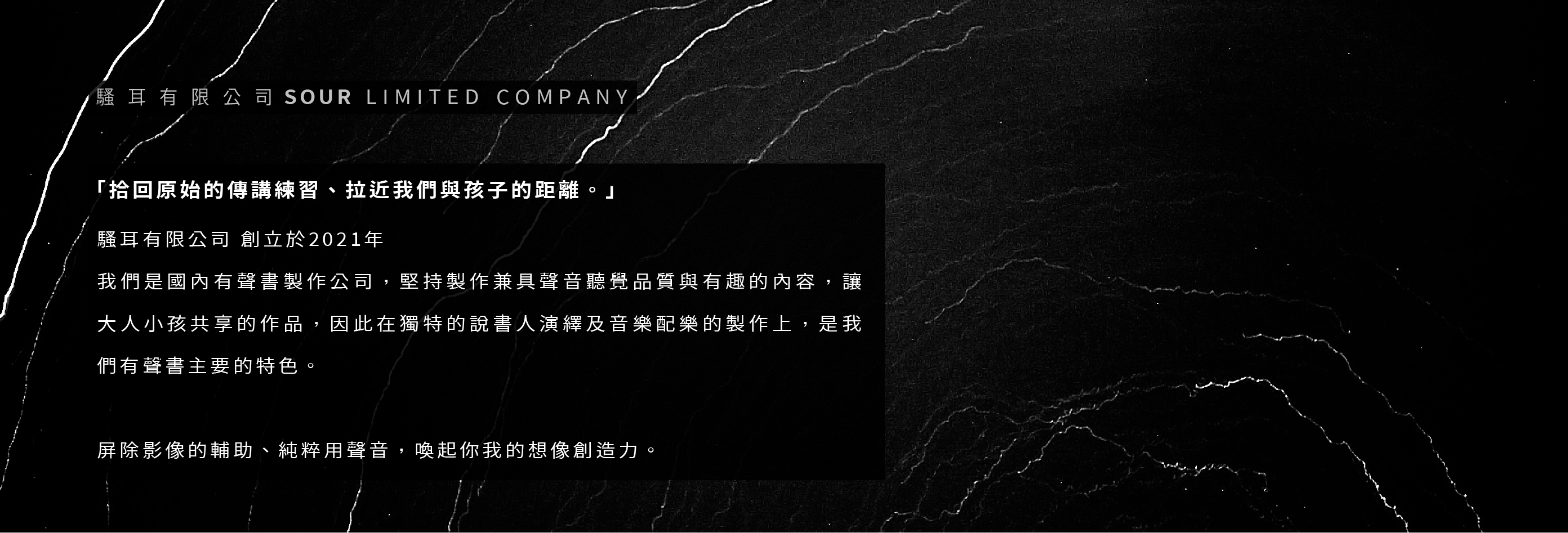 身處在數位時代的我們,閱讀變得不再是吸收資訊的唯一選擇,我們也漸漸地忽視掉文字的美。過去,人們透過口傳的方式紀錄許多傳統及故事。現在,騷耳將透過「有聲書」這項媒介,使我們再次學習聆聽故事、訴說故事,重新對文學感到興趣,從如此簡單的起心動念開啟了這趟旅程。